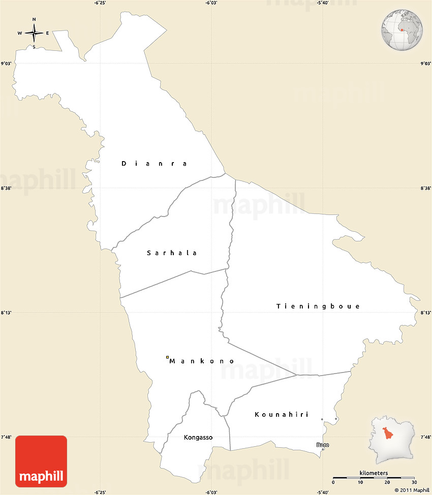 Each map type offers different information and each map style is designed for a different purpose. Read about the styles and map projection used in the above map (Classic Style Simple Map of Mankono, single color outside).