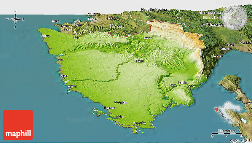 The panoramic physical map represents one of many map types and styles available. Look at Istra from different perspectives.