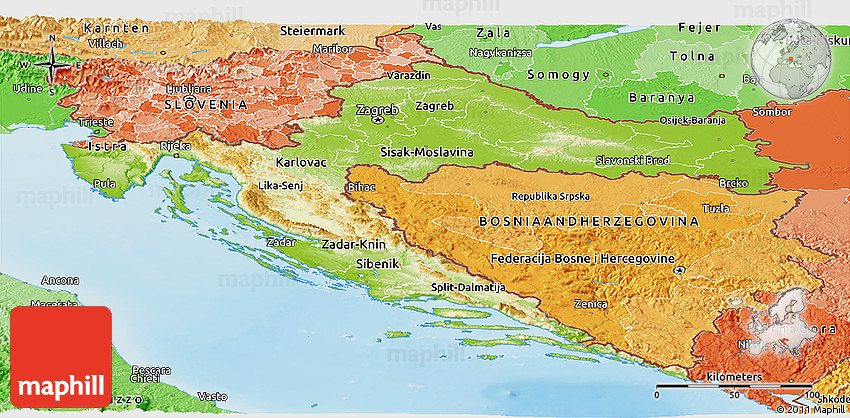 The panoramic physical map represents one of many map types and styles available. Look at Croatia from different perspectives.