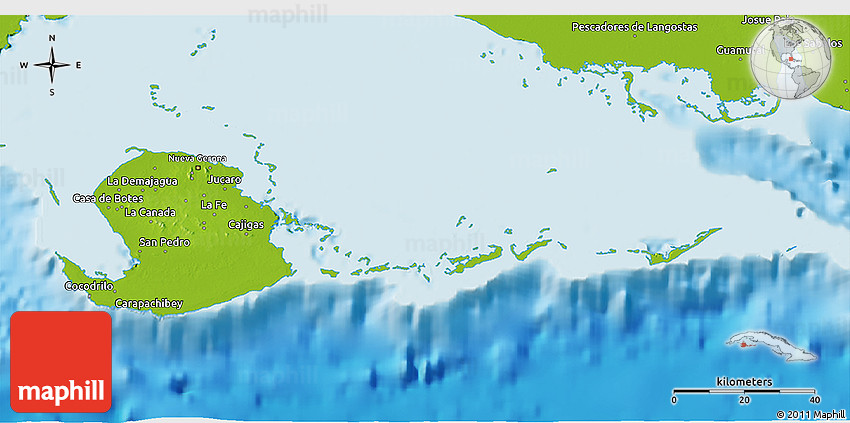 Physical map illustrates the mountains, lowlands, oceans, lakes and rivers and other physical landscape features of Isla de la Juventud. Differences in land elevations relative to the sea level are represented by color.