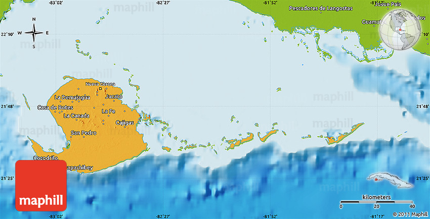 Physical map illustrates the mountains, lowlands, oceans, lakes and rivers and other physical landscape features of Isla de la Juventud. Differences in land elevations relative to the sea level are represented by color.