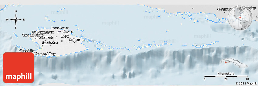 The panoramic silver style map represents one of many map types and styles available. Look at Isla de la Juventud from different perspectives.