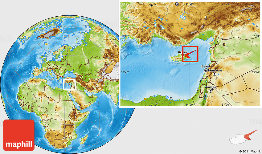 Maphill is a collection of map images. This image combines a physical map with the globe centered on Famagusta. Use the buttons under the image to switch to different map types.