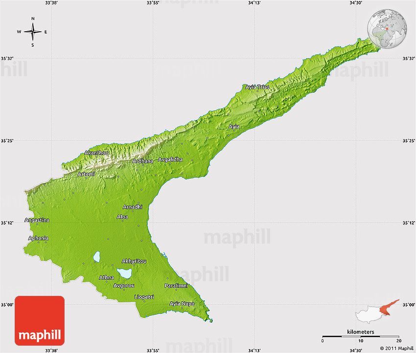 Physical map illustrates the mountains, lowlands, oceans, lakes and rivers and other physical landscape features of Famagusta. Differences in land elevations relative to the sea level are represented by color.