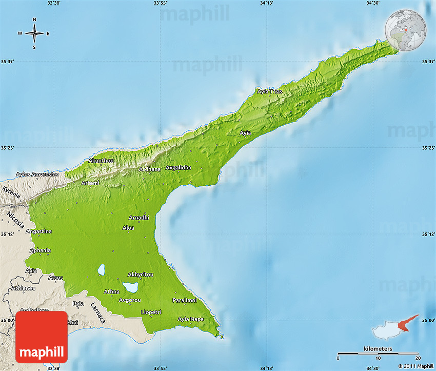 Physical map illustrates the mountains, lowlands, oceans, lakes and rivers and other physical landscape features of Famagusta. Differences in land elevations relative to the sea level are represented by color.