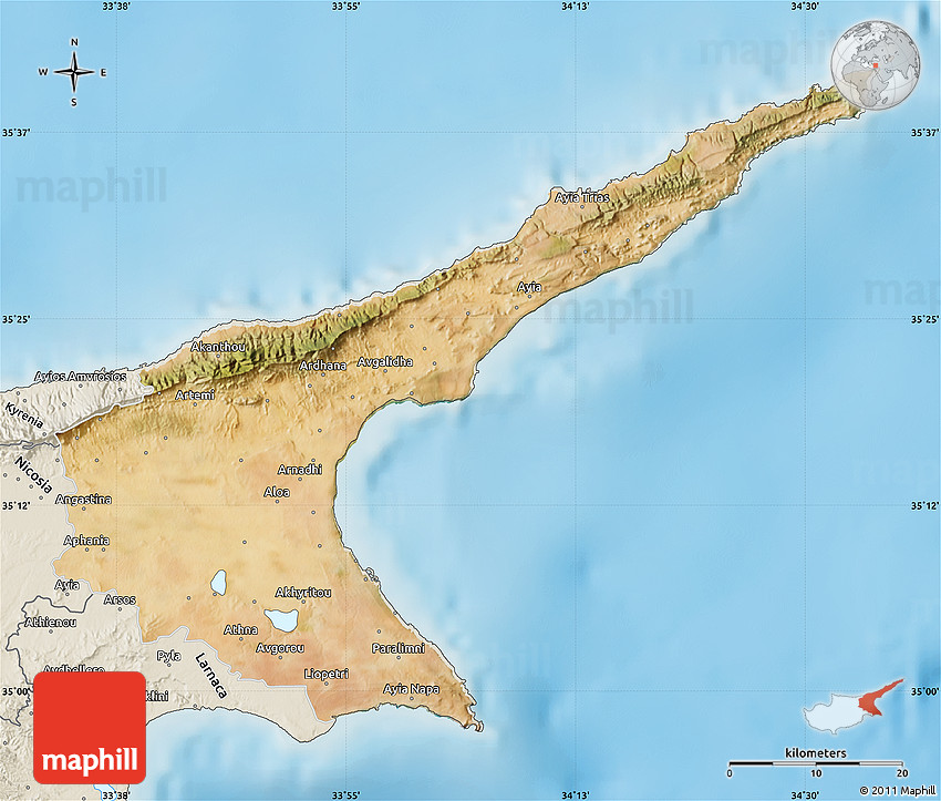 Shaded relief map shows landscape features, such as mountains, valleys and plateaus. Flat areas are smooth on the map, areas with steep slopes and mountains appear more rough. The above map of Famagusta was created using a digital elevation model.