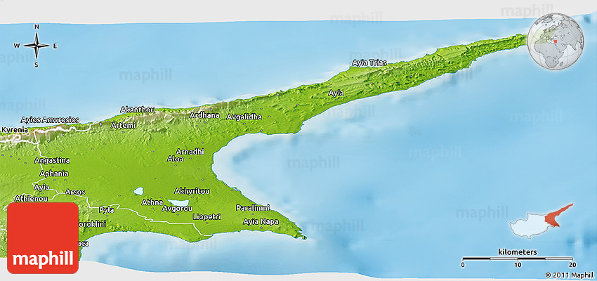 Physical map illustrates the mountains, lowlands, oceans, lakes and rivers and other physical landscape features of Famagusta. Differences in land elevations relative to the sea level are represented by color.