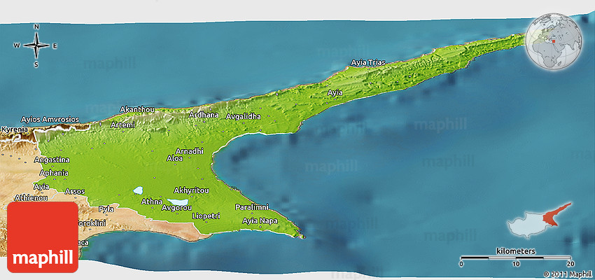 Physical map illustrates the mountains, lowlands, oceans, lakes and rivers and other physical landscape features of Famagusta. Differences in land elevations relative to the sea level are represented by color.