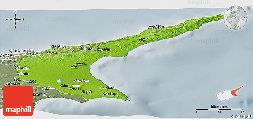 Physical map illustrates the mountains, lowlands, oceans, lakes and rivers and other physical landscape features of Famagusta. Differences in land elevations relative to the sea level are represented by color.