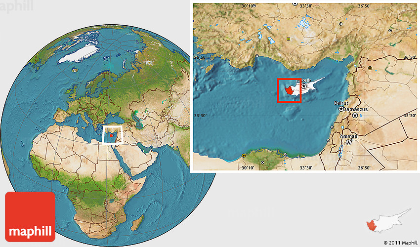 Maphill is a collection of map images. This image combines a satellite map with the globe centered on Paphos. Use the buttons under the image to switch to different map types.