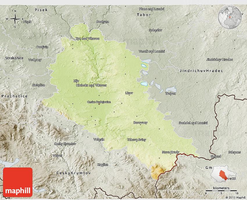 Physical map illustrates the mountains, lowlands, oceans, lakes and rivers and other physical landscape features of České Budějovice. Differences in land elevations relative to the sea level are represented by color.
