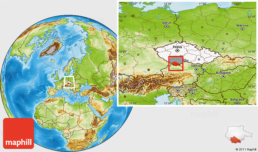 Maphill is a collection of map images. This image combines a physical map with the globe centered on Český Krumlov. Use the buttons under the image to switch to different map types.