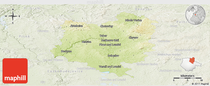 The panoramic physical map represents one of several map types and styles available. Look at Tábor, Jihočeský kraj, Czech Republic from different perspectives.