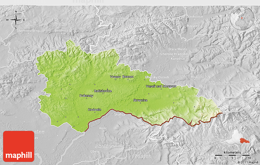 Physical map illustrates the mountains, lowlands, oceans, lakes and rivers and other physical landscape features of Hodonín. Differences in land elevations relative to the sea level are represented by color.
