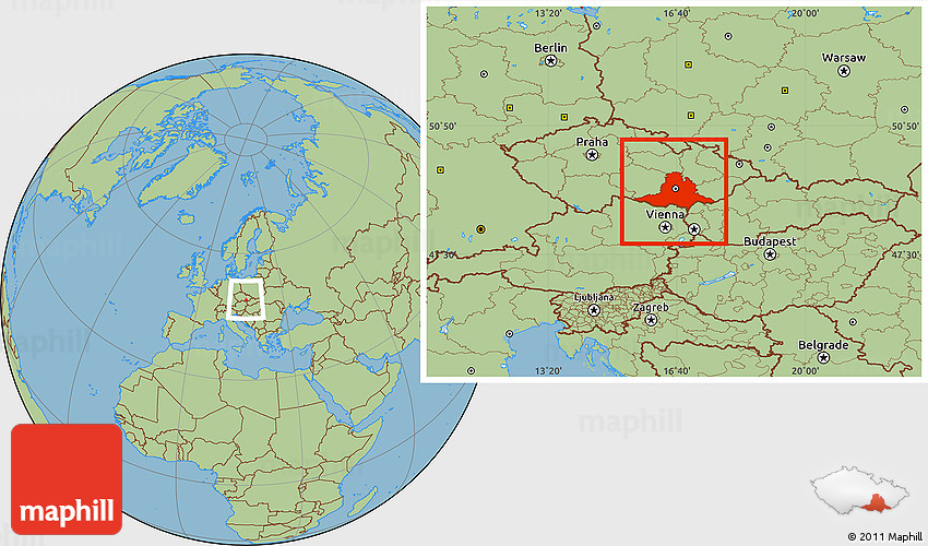 Maphill is a collection of map images. This image combines a savanna style map with the globe centered on Jihomoravský kraj. Use the buttons under the image to switch to different map types.
