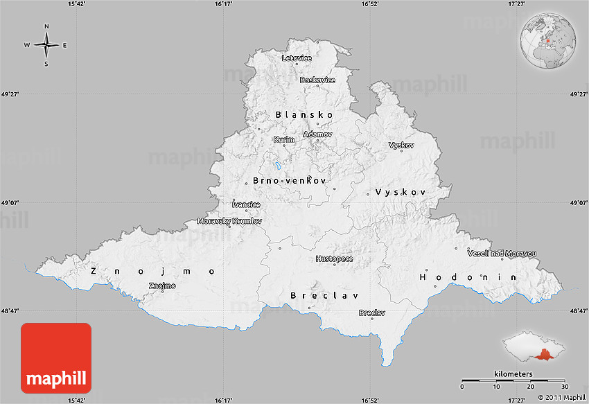 The grey colored map. Jihomoravský kraj is highlighted in white. This color scheme is similar to silver styled maps, but compared to the latter, a darker shade of gray is used.