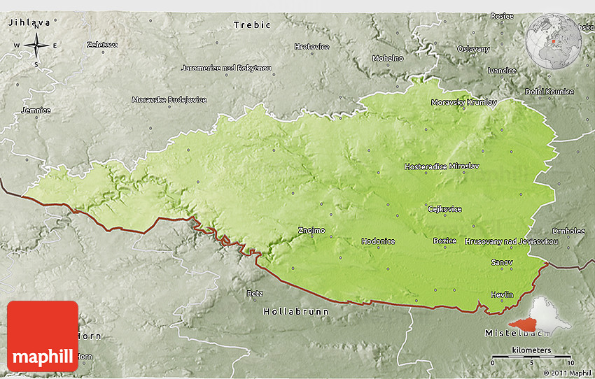 Physical map illustrates the mountains, lowlands, oceans, lakes and rivers and other physical landscape features of Znojmo. Differences in land elevations relative to the sea level are represented by color.