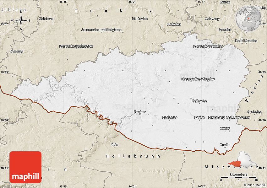 This map uses colors of vintage antique maps. Znojmo is highlighted with white. The rest of the map is beige colored shaded relief map.