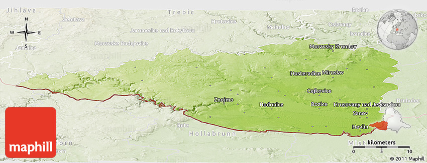 Each map type offers different information and each map style is designed for a different purpose. Read about the styles and map projection used in the above map (Physical Panoramic Map of Znojmo, lighten).