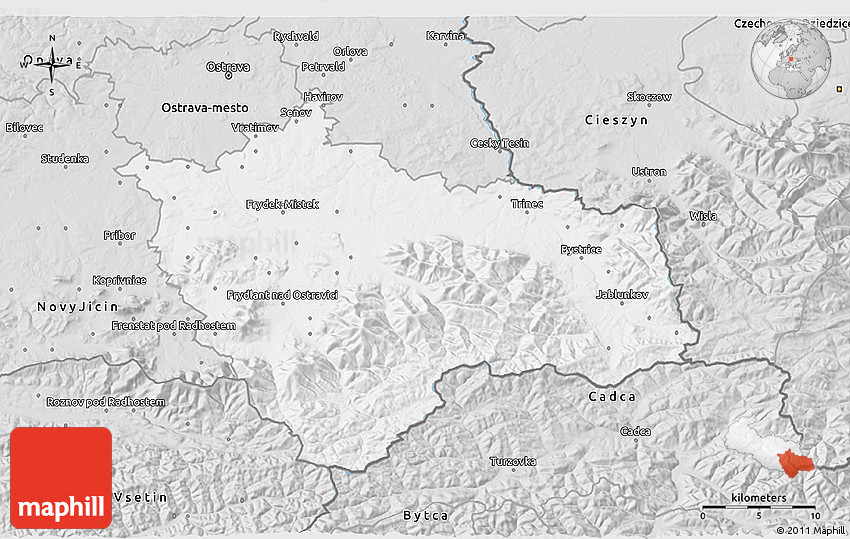The 3D silver style map represents one of several map types and styles available. Look at Frýdek-Místek, Moravskoslezský kraj, Czech Republic from different perspectives.