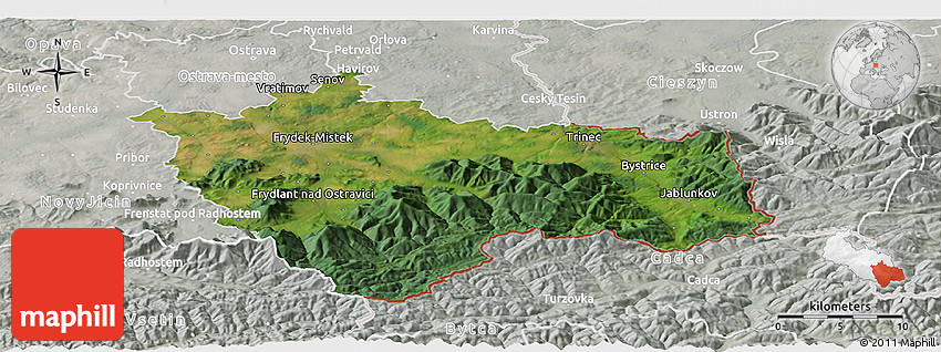 The panoramic satellite map represents one of several map types and styles available. Look at Frýdek-Místek, Moravskoslezský kraj, Czech Republic from different perspectives.