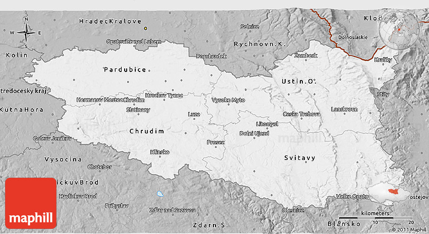 The grey colored map. Pardubický kraj is highlighted in white. This color scheme is similar to silver styled maps, but compared to the latter, a darker shade of gray is used.