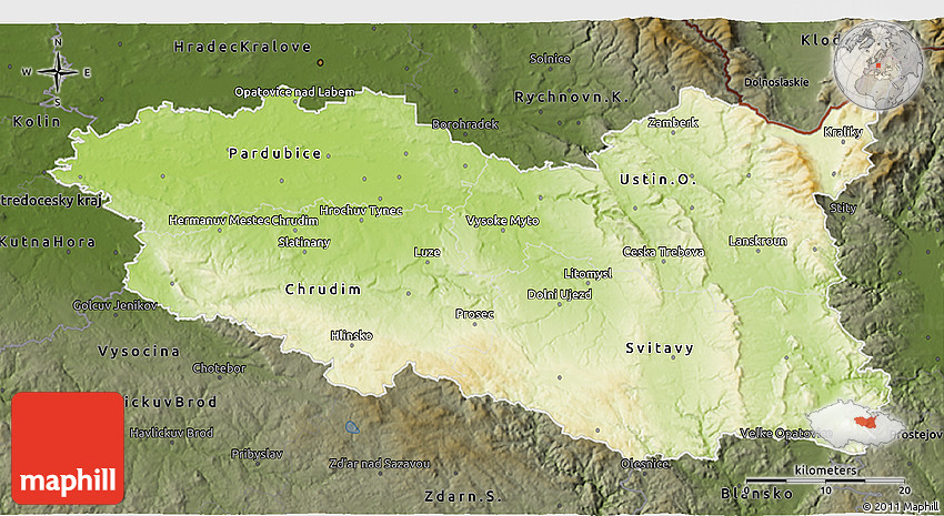 Physical map illustrates the mountains, lowlands, oceans, lakes and rivers and other physical landscape features of Pardubický kraj. Differences in land elevations relative to the sea level are represented by color.