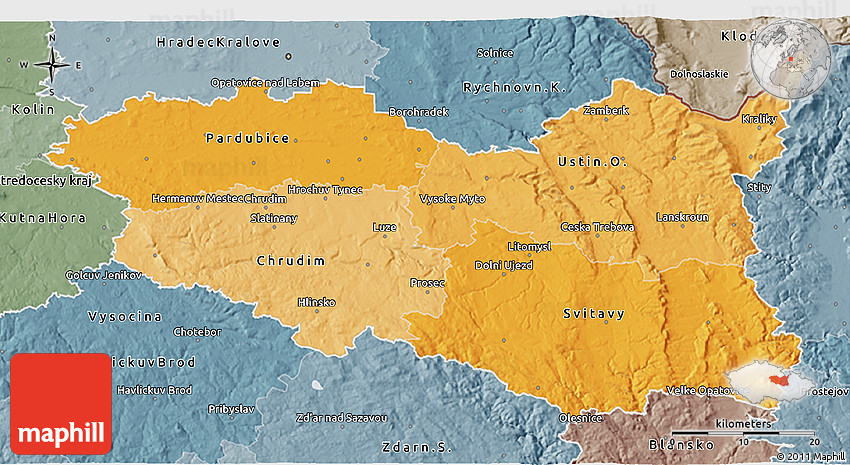 Political shades map is similar to a political map, however different regions are represented by the tints and shades of the same color, not by different colors. The purpose of a political map of Pardubický kraj is to provide information about how people have divided up the world into countries and administrative regions.