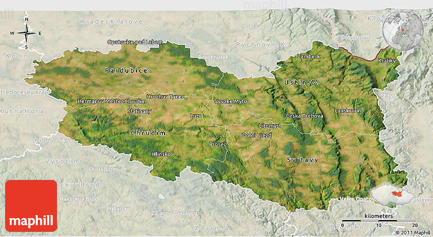Satellite map shows the Earth's surface as it really looks like. The above map is based on satellite images taken on July 2004. This satellite map of Pardubický kraj is meant for illustration purposes only. For more detailed maps based on newer satellite and aerial images switch to a detailed map view.
