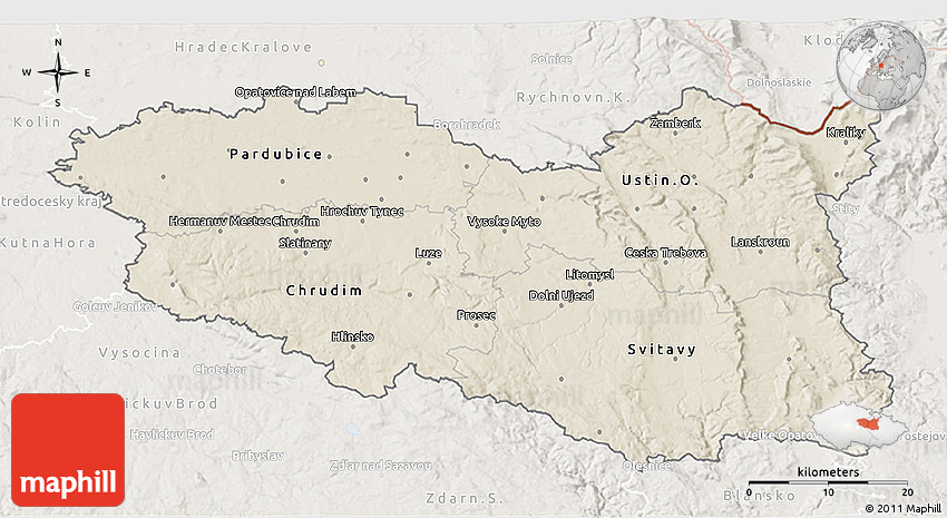 Shaded relief map shows landscape features, such as mountains, valleys and plateaus. Flat areas are smooth on the map, areas with steep slopes and mountains appear more rough. The above map of Pardubický kraj was created using a digital elevation model.