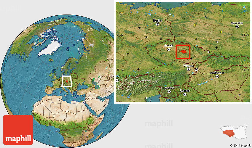 Maphill is a collection of map images. This image combines a satellite map with the globe centered on Chrudim. Use the buttons under the image to switch to different map types.