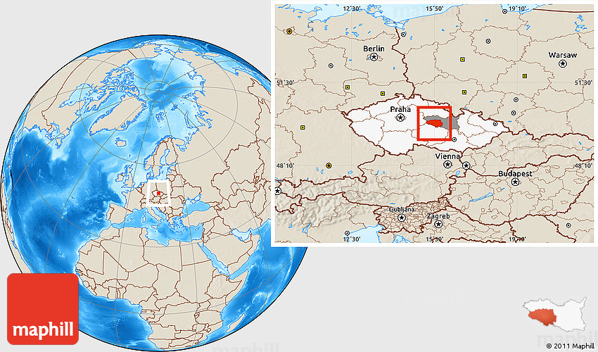 Maphill is a collection of map images. This image combines a shaded relief map with the globe centered on Chrudim. Use the buttons under the image to switch to different map types.