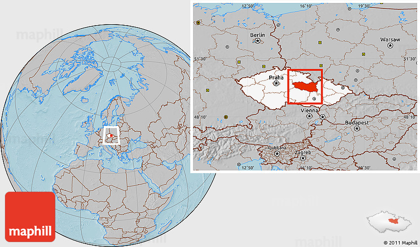 Maphill is a collection of map images. This image combines a gray map with the globe centered on Pardubický kraj. Use the buttons under the image to switch to different map types.