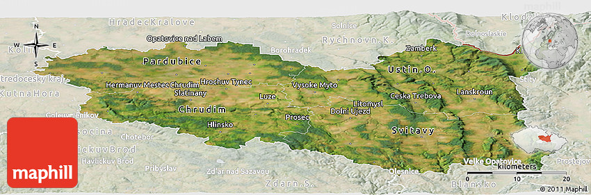 The panoramic satellite map represents one of many map types and styles available. Look at Pardubický kraj from different perspectives.