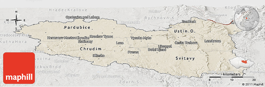 Shaded relief map shows landscape features, such as mountains, valleys and plateaus. Flat areas are smooth on the map, areas with steep slopes and mountains appear more rough. The above map of Pardubický kraj was created using a digital elevation model.