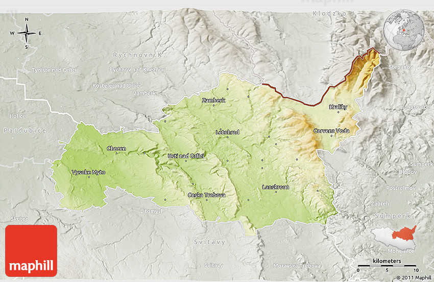 The 3D physical map represents one of several map types and styles available. Look at Ústí n.O., Pardubický kraj, Czech Republic from different perspectives.