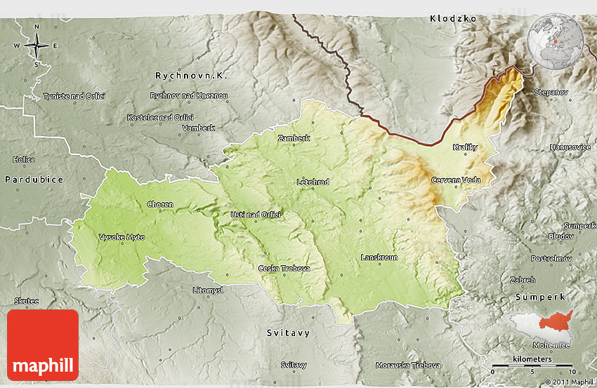 The 3D physical map represents one of several map types and styles available. Look at Ústí n.O., Pardubický kraj, Czech Republic from different perspectives.