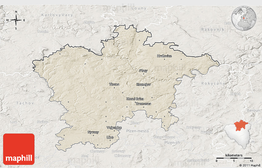 Shaded relief map shows landscape features, such as mountains, valleys and plateaus. Flat areas are smooth on the map, areas with steep slopes and mountains appear more rough. The above map of Plzeň-sever was created using a digital elevation model.