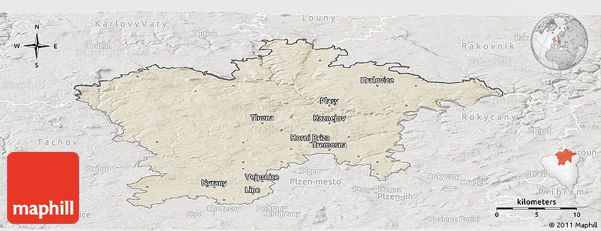 Shaded relief map shows landscape features, such as mountains, valleys and plateaus. Flat areas are smooth on the map, areas with steep slopes and mountains appear more rough. The above map of Plzeň-sever was created using a digital elevation model.