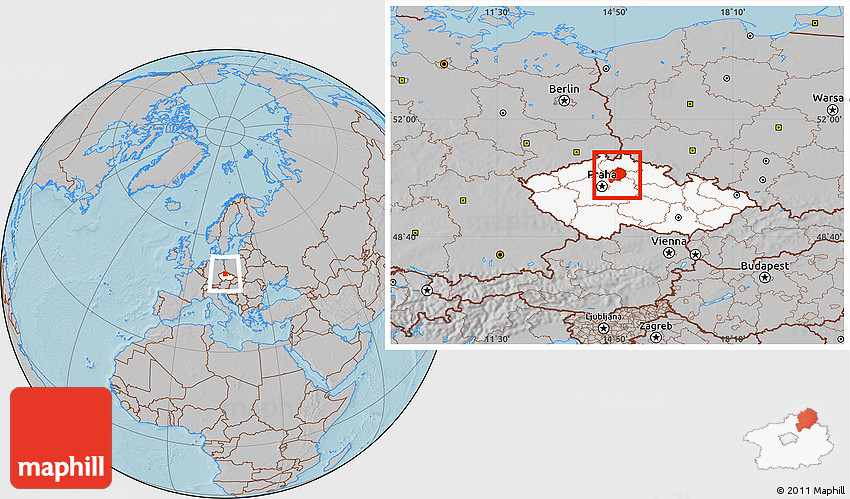 Maphill is a collection of map images. This image combines a gray map with the globe centered on Mladá Boleslav. Use the buttons under the image to switch to different map types.