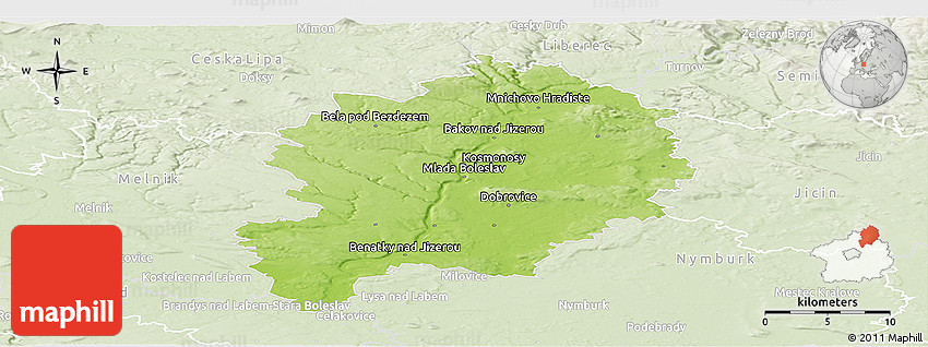 The panoramic physical map represents one of several map types and styles available. Look at Mladá Boleslav, Středočeský kraj, Czech Republic from different perspectives.