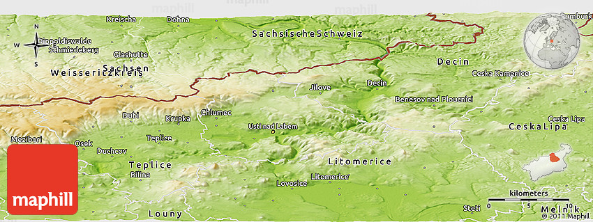 The panoramic physical map represents one of several map types and styles available. Look at Ústí n.L., Ústecký kraj, Czech Republic from different perspectives.