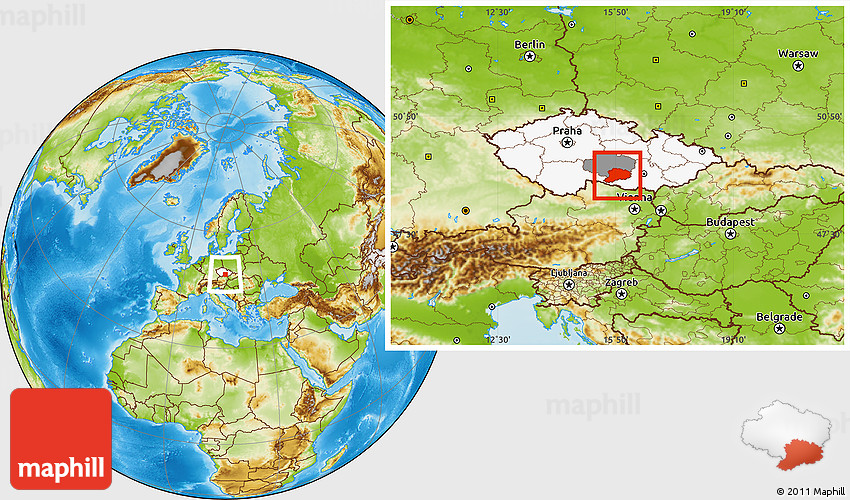 Maphill is a collection of map images. This image combines a physical map with the globe centered on Třebíč. Use the buttons under the image to switch to different map types.