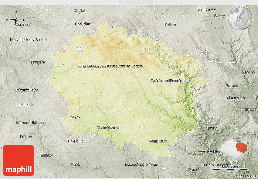 Physical map illustrates the mountains, lowlands, oceans, lakes and rivers and other physical landscape features of Žďár n.S.. Differences in land elevations relative to the sea level are represented by color.