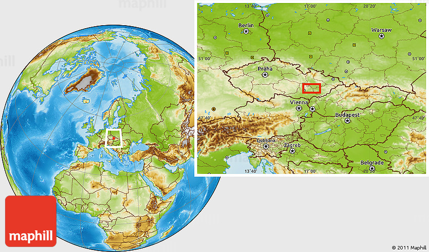 Maphill is a collection of map images. This image combines a physical map with the globe centered on Šelešovice. Use the buttons under the image to switch to different map types.