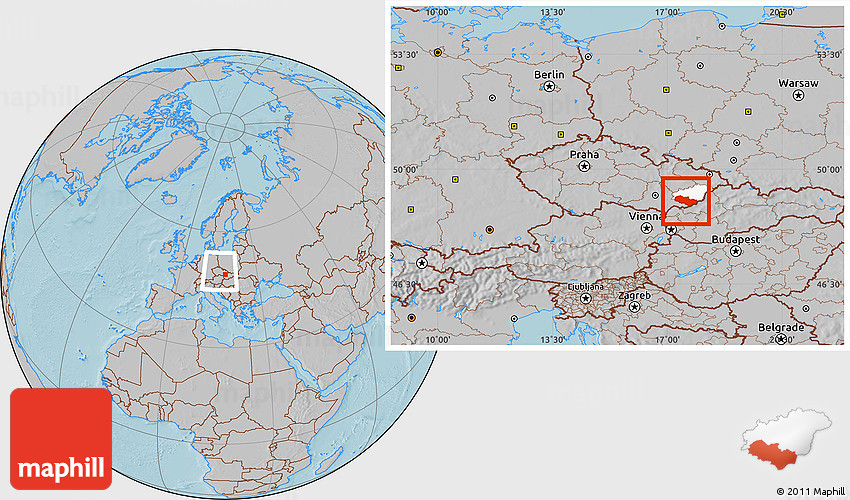 Maphill is a collection of map images. This image combines a gray map with the globe centered on Uherské Hradiště. Use the buttons under the image to switch to different map types.