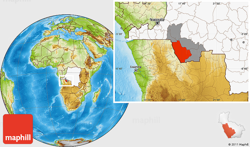 Maphill is a collection of map images. This image combines a physical map with the globe centered on Kasonga-Lunda. Use the buttons under the image to switch to different map types.