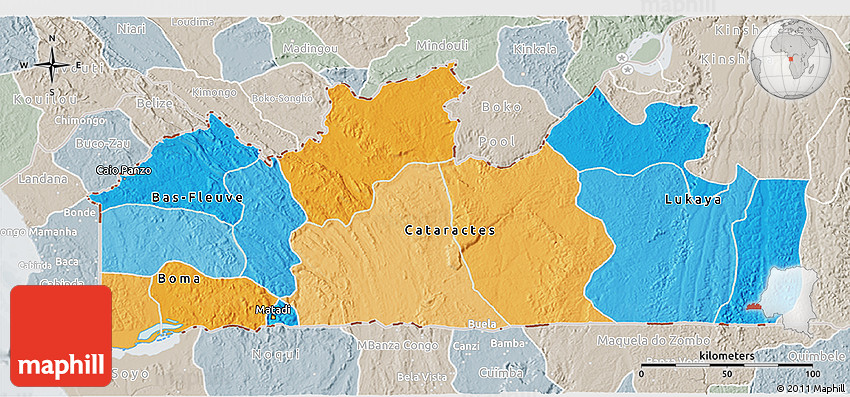 The value of Maphill lies in the possibility to look at the same area from several perspectives. Maphill presents the map of Bas-Zaire in a wide variety of map types and styles.