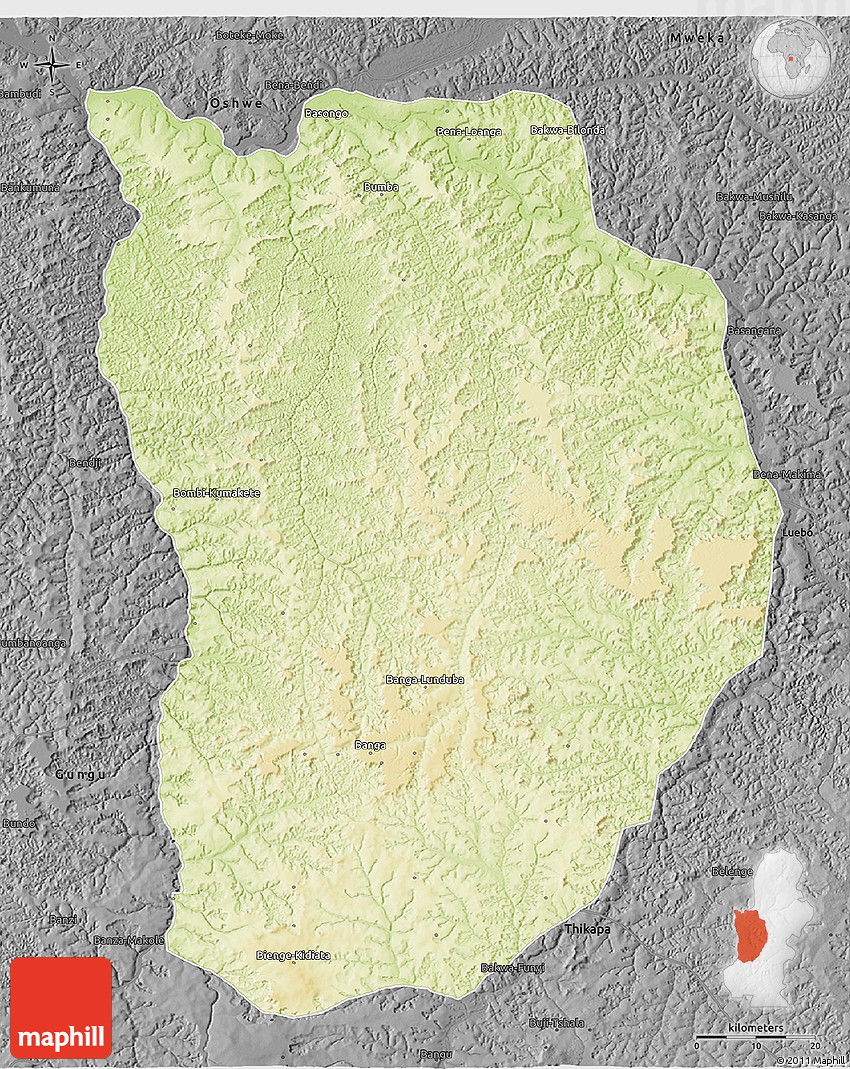 Physical map illustrates the mountains, lowlands, oceans, lakes and rivers and other physical landscape features of Ilebo. Differences in land elevations relative to the sea level are represented by color.