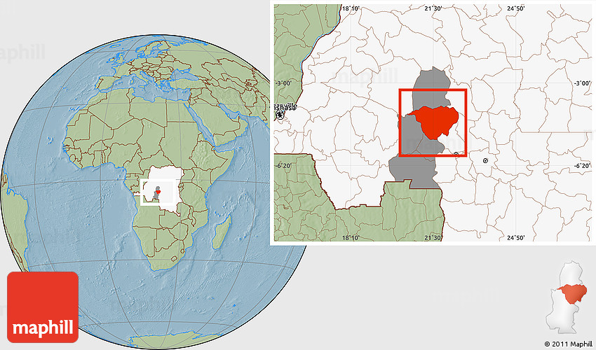 The location map of Mweka combines two projections: the orthographic azimuthal projection for the globe and the simple geographic projection for the rectangular part of the map. Geographic projection has straight meridians and parallels, each degree of latitude and longitude is the same size over the entire world map.